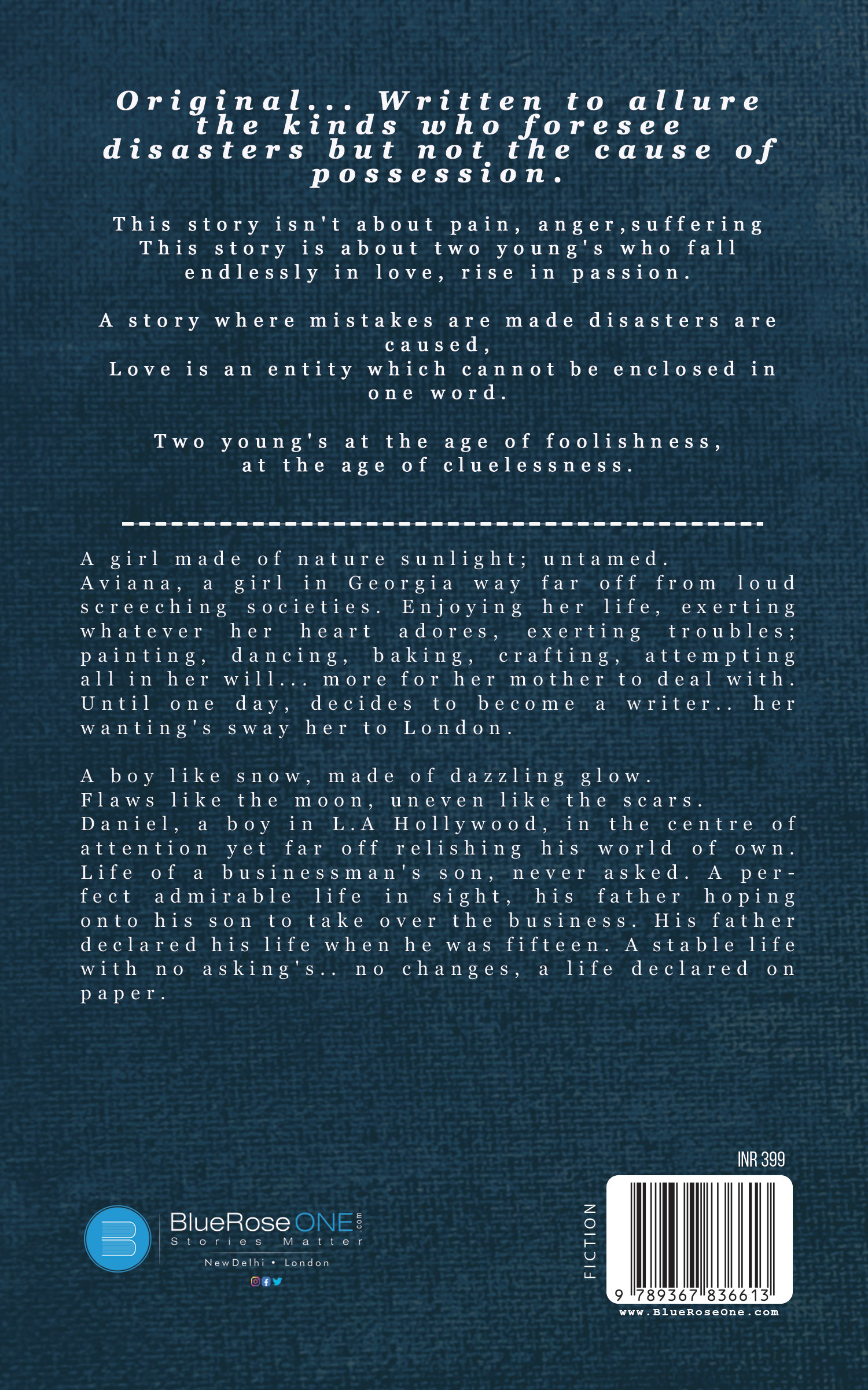 This story isn’t about pain, anger, suffering. This story is about two young’s who fall endlessly in love, rise in passion. A story where mistakes are made, disasters are caused, Love is an entity which cannot be enclosed in one word. Two young’s at the age of foolishness, at the age of cluelessness. Aviana, a girl in Georgia, way far off from loud screeching societies. Enjoying her life, exerting whatever her heart adores attempting all in her will… more for her mother to deal with. Until one day, decides to become a writer.. her wanting’s sway her to London. Daniel, a boy in L.A Hollywood, in the centre of attention yet far off relishing his world of own. Life of a rich man, never asked what he wants. A perfect admirable life in sight, His father declared his life when he was fifteen.